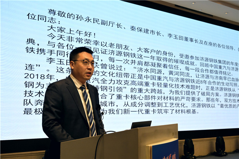 李玉田在致辭中介紹,濟(jì)鋼自1958年建廠至今,已走過67年風(fēng)雨歷程。在黨的方針路線指引下,企業(yè)不斷發(fā)展壯大。尤其是新世紀(jì)以來,瞄準(zhǔn)市場需求,累計投資200余億元,堅定不移推進(jìn)產(chǎn)品“普轉(zhuǎn)優(yōu)、優(yōu)轉(zhuǎn)特、特轉(zhuǎn)精”戰(zhàn)略轉(zhuǎn)型,現(xiàn)已成長為中國優(yōu)特鋼行業(yè)骨干力量,進(jìn)入了特鋼行業(yè)的核心陣容。多年來,作為高端裝備制造業(yè)關(guān)鍵零部件材料供應(yīng)商,濟(jì)鋼實現(xiàn)了由省內(nèi)用戶到省外用戶、由國內(nèi)用戶到國際用戶、由普通品牌到著名品牌、由國內(nèi)品牌到國際品牌的跨越。在商用車、乘用車、電動新能源車、工程機(jī)械、農(nóng)業(yè)機(jī)械、風(fēng)電能源、鐵路軌道交通等領(lǐng)域,在軸承、齒輪、彈簧、緊固件等多行業(yè)贏得國內(nèi)外400多家用戶的廣泛認(rèn)可與質(zhì)量認(rèn)證,并穩(wěn)定供應(yīng)產(chǎn)品。已與中國重汽、中國一汽等國內(nèi)領(lǐng)軍企業(yè),以及美馳、戴姆勒、豐田等國際知名企業(yè)建立了戰(zhàn)略合作關(guān)系。如今,濟(jì)鋼的用戶遍天下,產(chǎn)品直供比達(dá)90%以上。